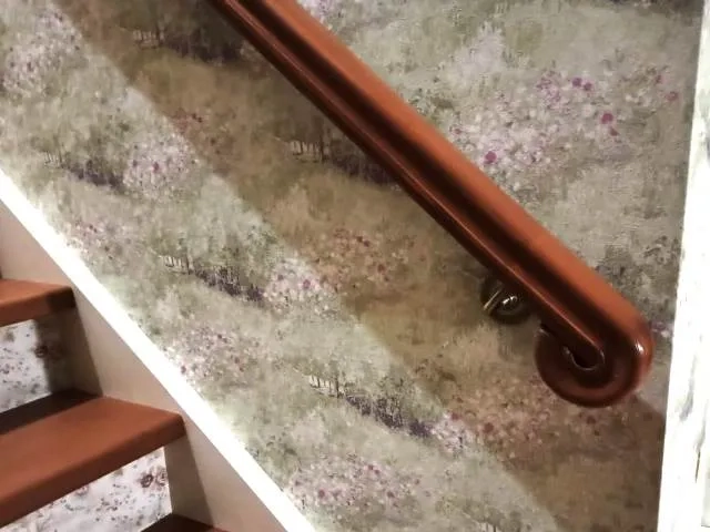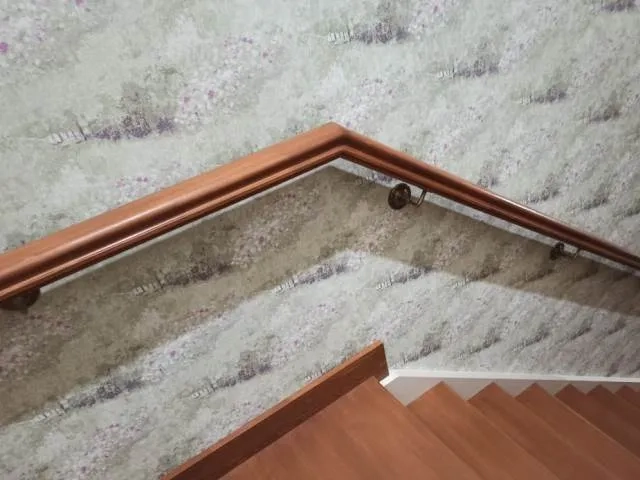 Перила установленные на стену вдоль первого марша лестницы сделаны в стиле и такой же формы и профиля, как и на самой лестнице. В начале поручня мы установили гнутый элемент в виде "улитки". Поручни пристенные крепятся на специальные крепежи из меди (продаются в строительных магазинах, в магазинах по продаже элементов и комплектующих для лестниц и торговых центрах).