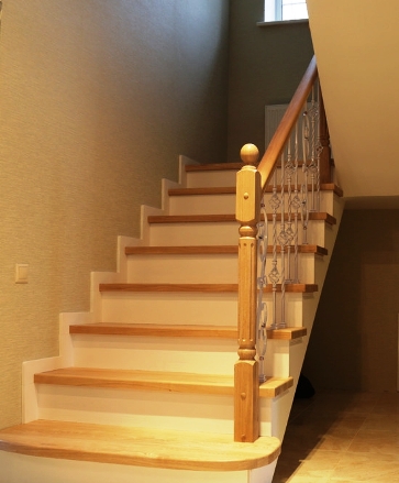 Эта лестница сделана из бука и массива сосны. Такие лестницы называются комбинированные, в частности эта лестница сделана из бука и сосны. Стоимость данного заказа по изготовлению, покраске и установке комбинированной лестницы составил 300 000 рублей (цена 2020 года), это вместе с кованными балясинами из металла.